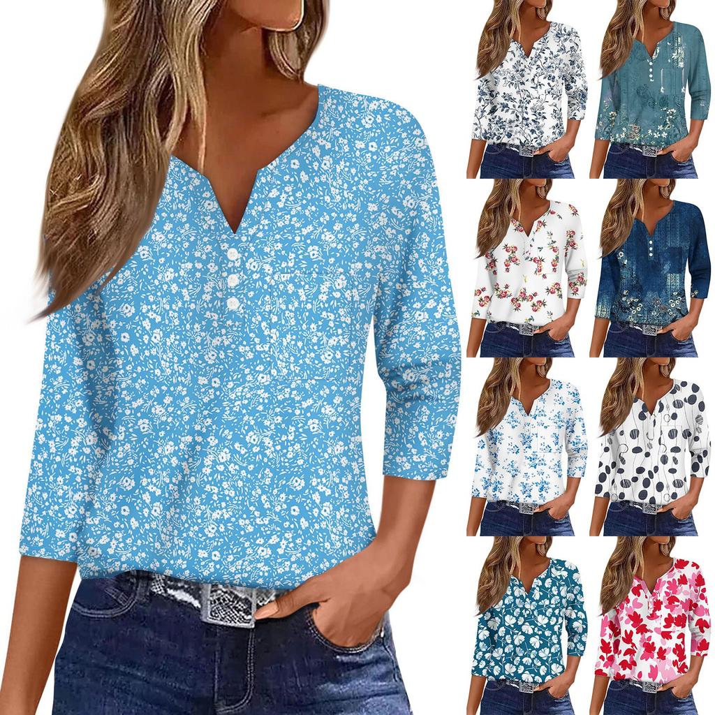 Damska Codzienna Modna Dekolt V Luźna Wszechstronna Kwiatowy Wzór Rękawy Trzyczwarte