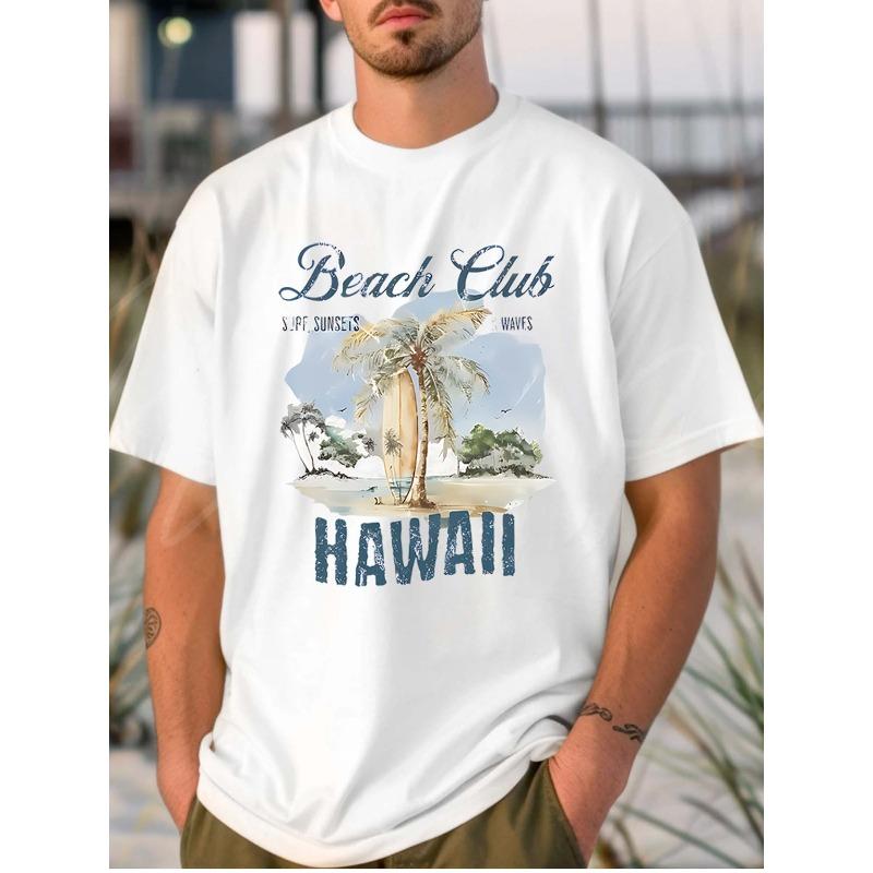 European sizes Men's White T-Shirt: "Beach Club Hawaii" Tropical Print