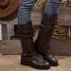 Damskie Skórzane Buty Jeździeckie z Okrągłym Noskiem i Łatami, Wysokie Buty na Kwadratowym Obcasie z Paskiem na Klamrę, Duże Rozmiary Buty Jesienno-Zimowe