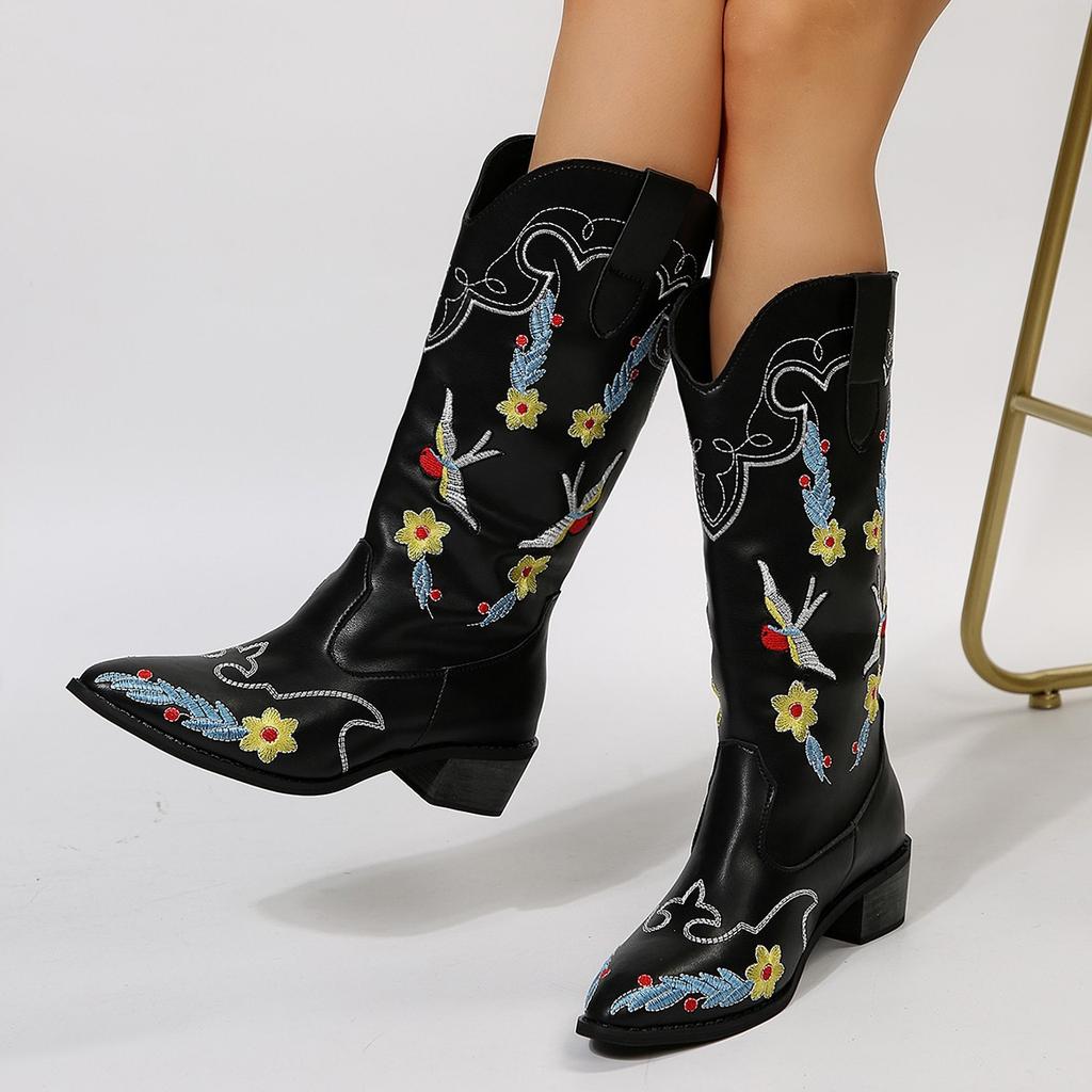 Women's Tall Riding Boots Autumn and Winter New Mid-Heel Martin Boots Women's Pointed Embroidered Boots