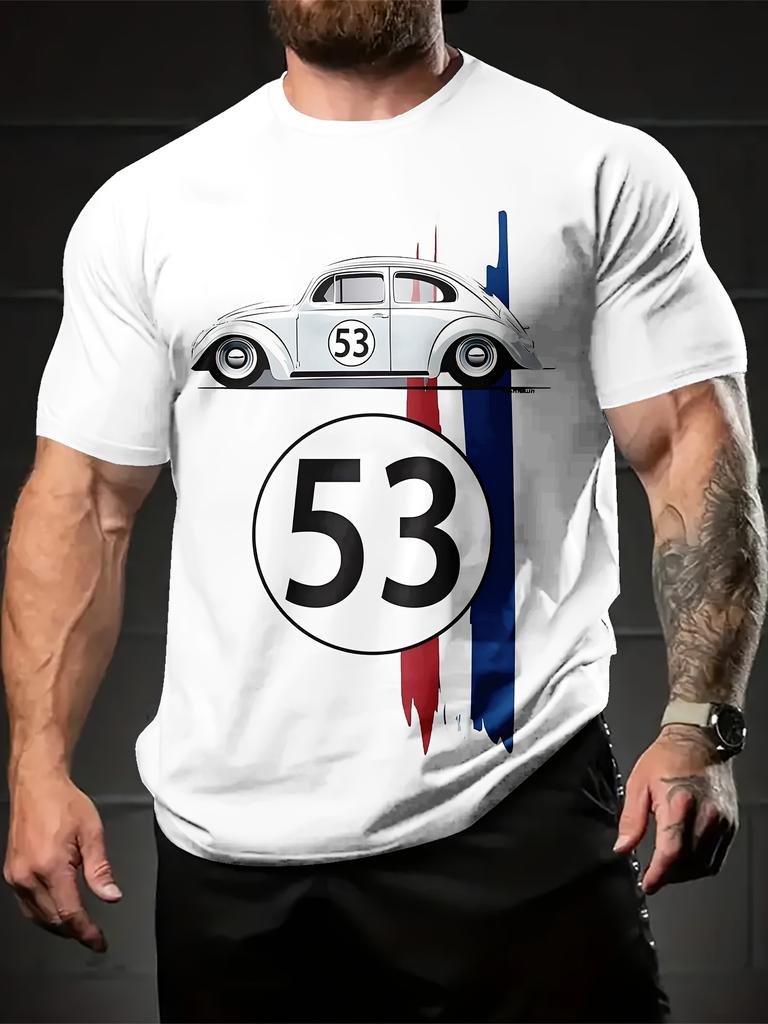 Retro racing pattern Tshirt mens casual round neck slightly stretchy summer street fashion short sleeved top
