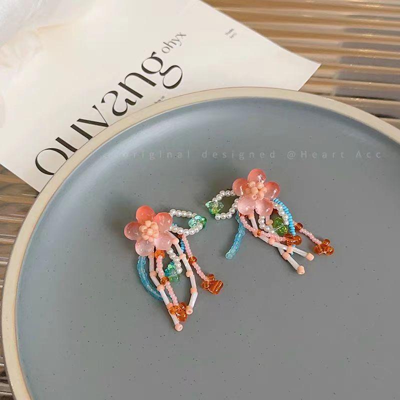 Glazurowane małe kwiatowe kolczyki sztyfty z frędzlami i koralikami, kolczyki wakacyjne z leśną energią, kolczyki odpowiednie do twarzy kwadratowych i okrągłych