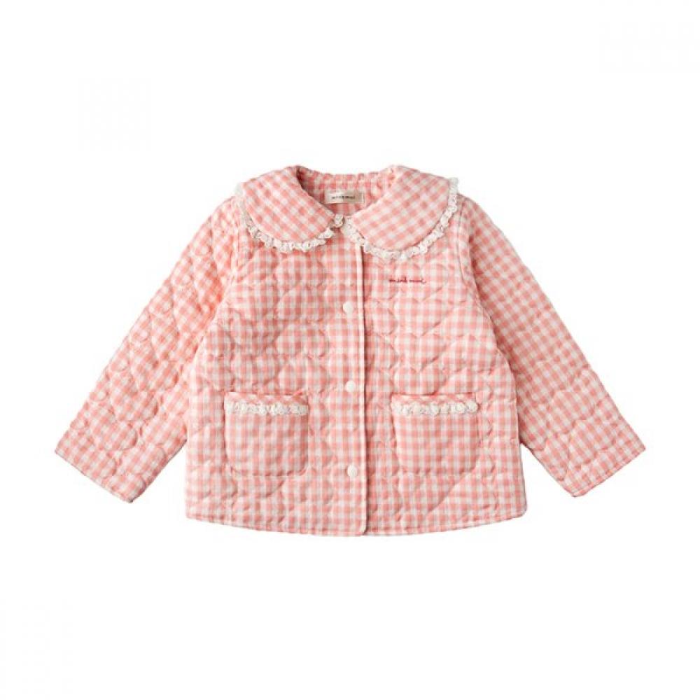 The Mink Mu Heart Quilting Padding Jacket is a refreshing pink check padded jacket. It enhances loveliness with heart quilting and features lace details on the collar and pockets. This jacket is perfect for transitional seasons, providing a lightweight yet warm wearing experience.