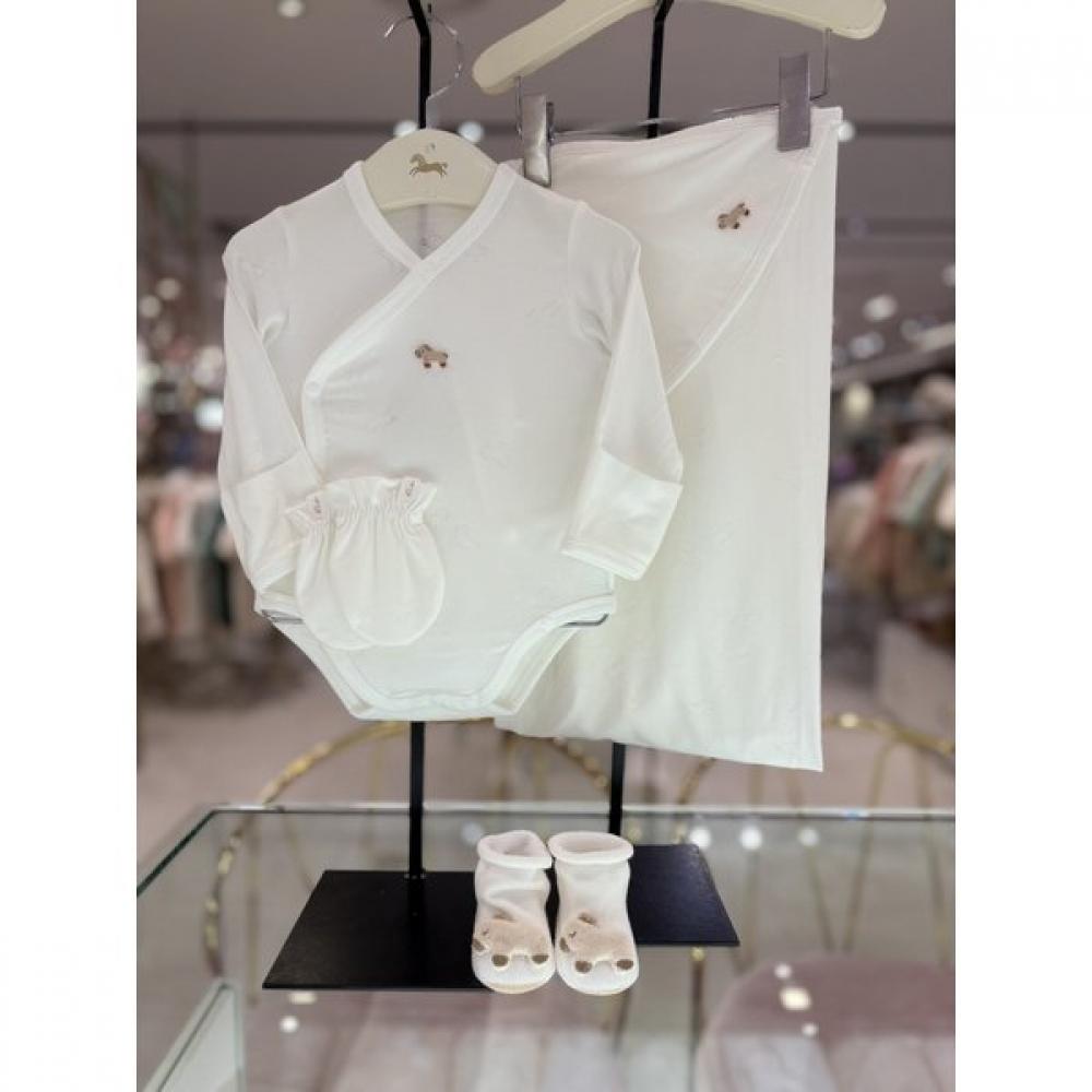 The Etwa baby suit set is a gift set themed around the zodiac for newborns. This set consists of a cute baby suit, a wrap, mittens, and socks, all designed with consideration for the comfort of newborns. The baby suit protects the baby’s belly and body, while the wrap is used in a blanket style to provide a sense of security. The mittens protect the baby’s hands, and the socks keep the feet warm.
