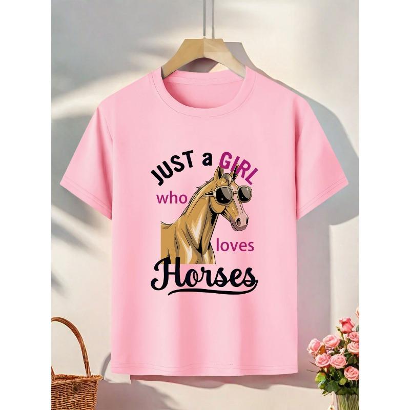 European sizes Cool And Stylish T-Shirt Featuring a Horse Wearing Glasses, Print with The Phrase 'JUST a GIRL Who Loves Horses'.