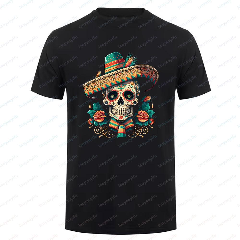 Cotton Summer Short Sleeve Mexican Skull Unisex Tee Round Neck Breathable Vintage Pattern Graphic Shortsleeved Launched Top