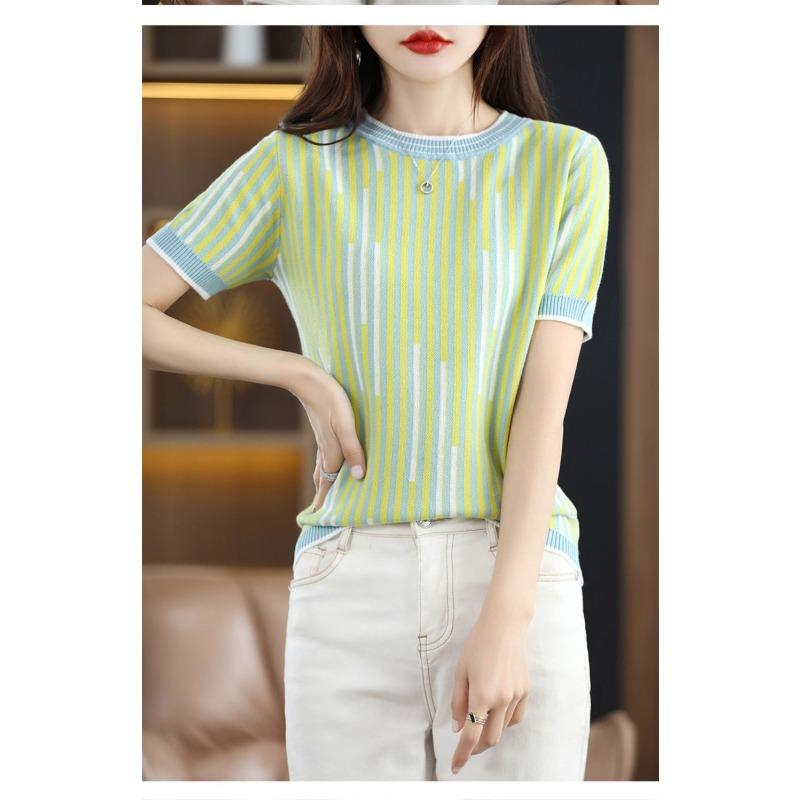 Summer Women's Striped Knit Top | Crew Neck Short Sleeve Slim Casual T-Shirt