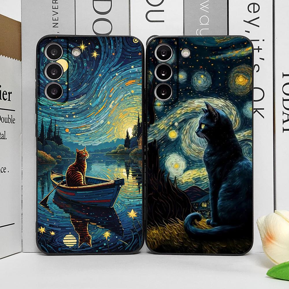 Cute Van-Gogh Starry Night Cat Phone Case for Samsung Galaxy S22 S23 S24 Ultra S25 Plus S21 FE 5G Soft Silicon Cover Fundas Capa