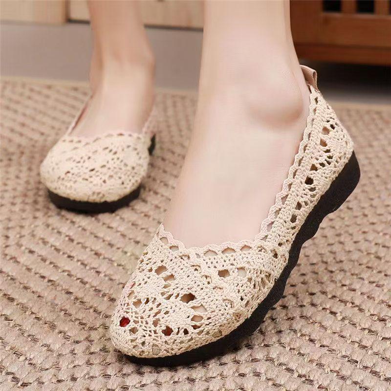Woman's New Summer Flat Sole Big Size Hollow Lace Nude Shoes Soft Sole Non Slip Breathable Shallow Slip-On Round Toe Sandals