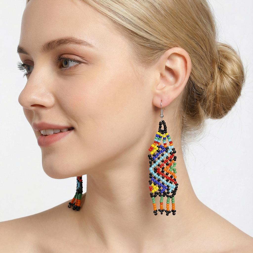 European and American ethnic style handmade rice bead fringed earrings, niche design sense vintage retro earrings