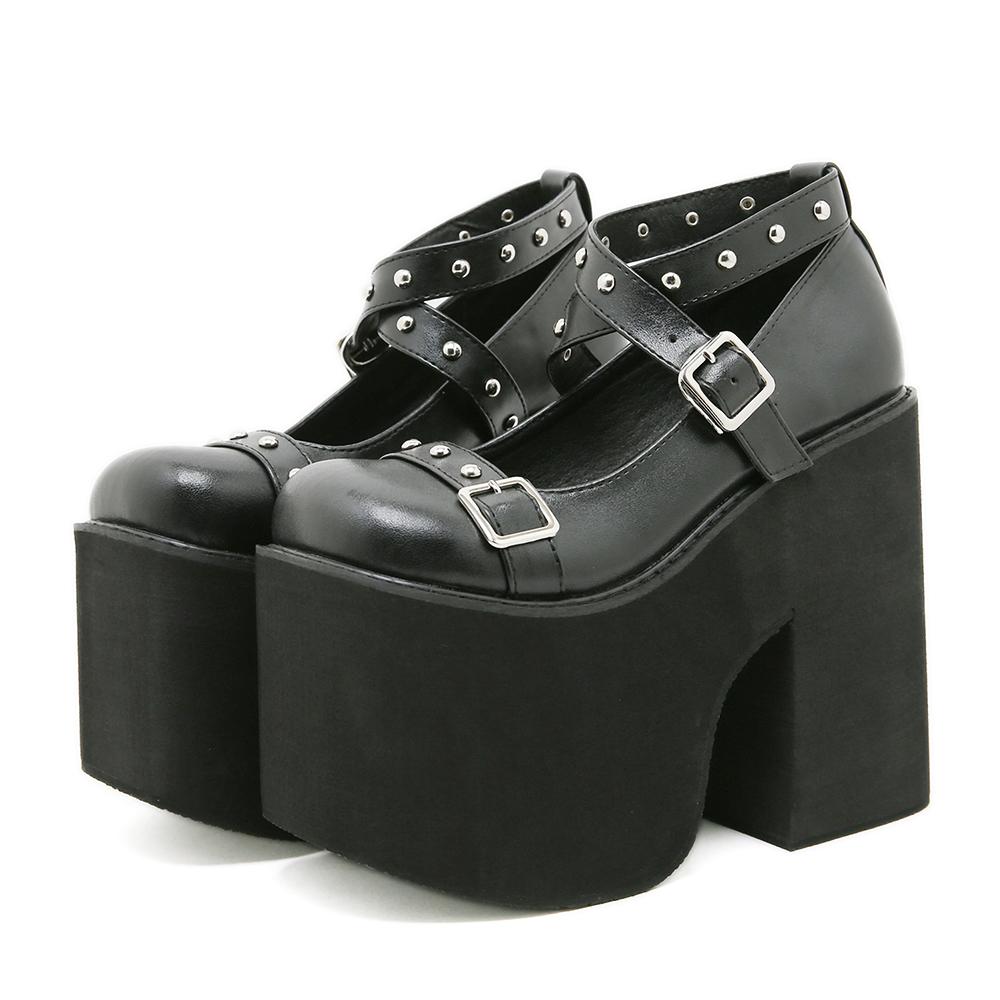 Gdgydh Punk Style Black Rivet Buckle High Heels Shoes for Women Trendy Gothic Waterproof Platform Shoes Belt Buckle Chunky Heels