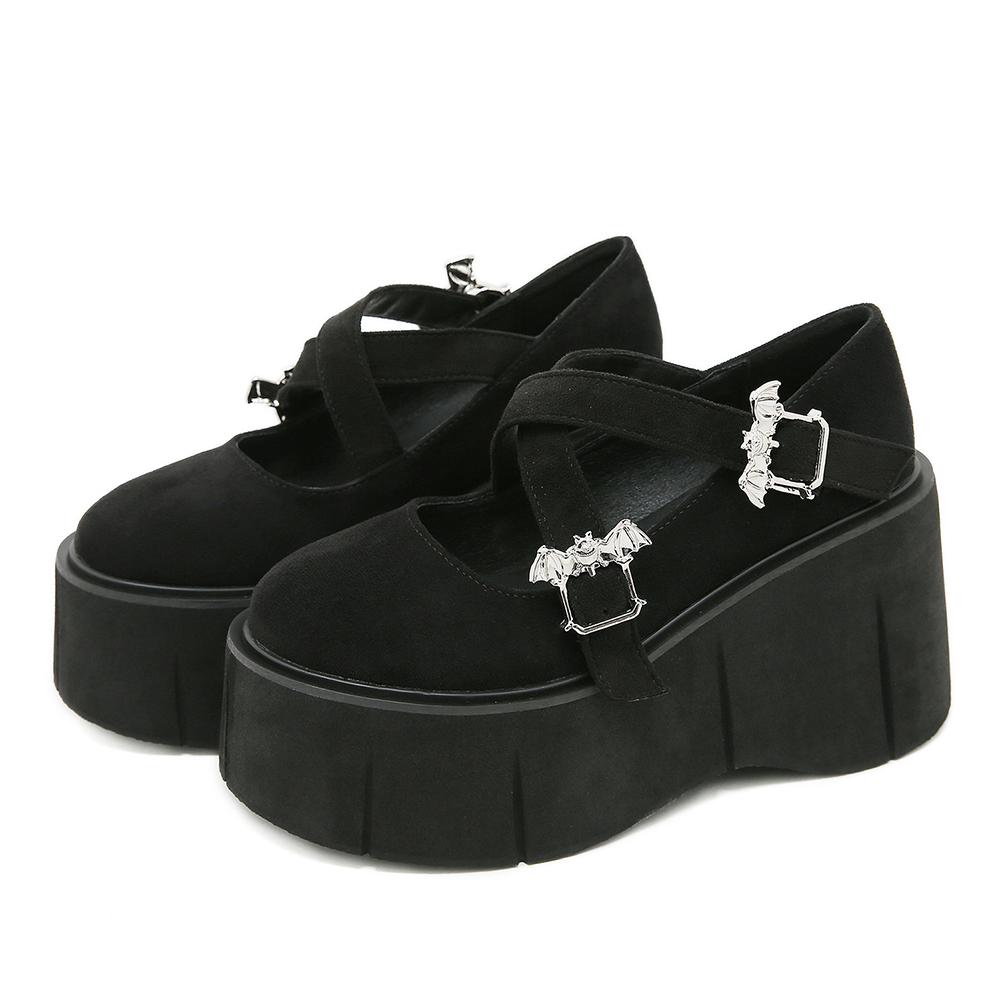 Gdgydh Damskie Gotyckie Buty Mary Jane na Platformie Gruba Podeszwa Wodoodporne Obcasy na Platformie Krzyżowe Klamry Koturny Klamra w Kształcie Nietoperza