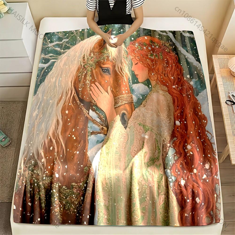 Horse and Woman Nature Scene Print Blanket Flannel Material Soft Warm for All Seasons Home Outdoor Camping Picnics Luxury Gifts