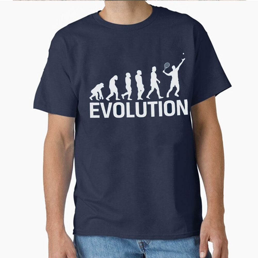 Evolution Of Tennis T Shirt from ape through prehistoric man to tennis player serving