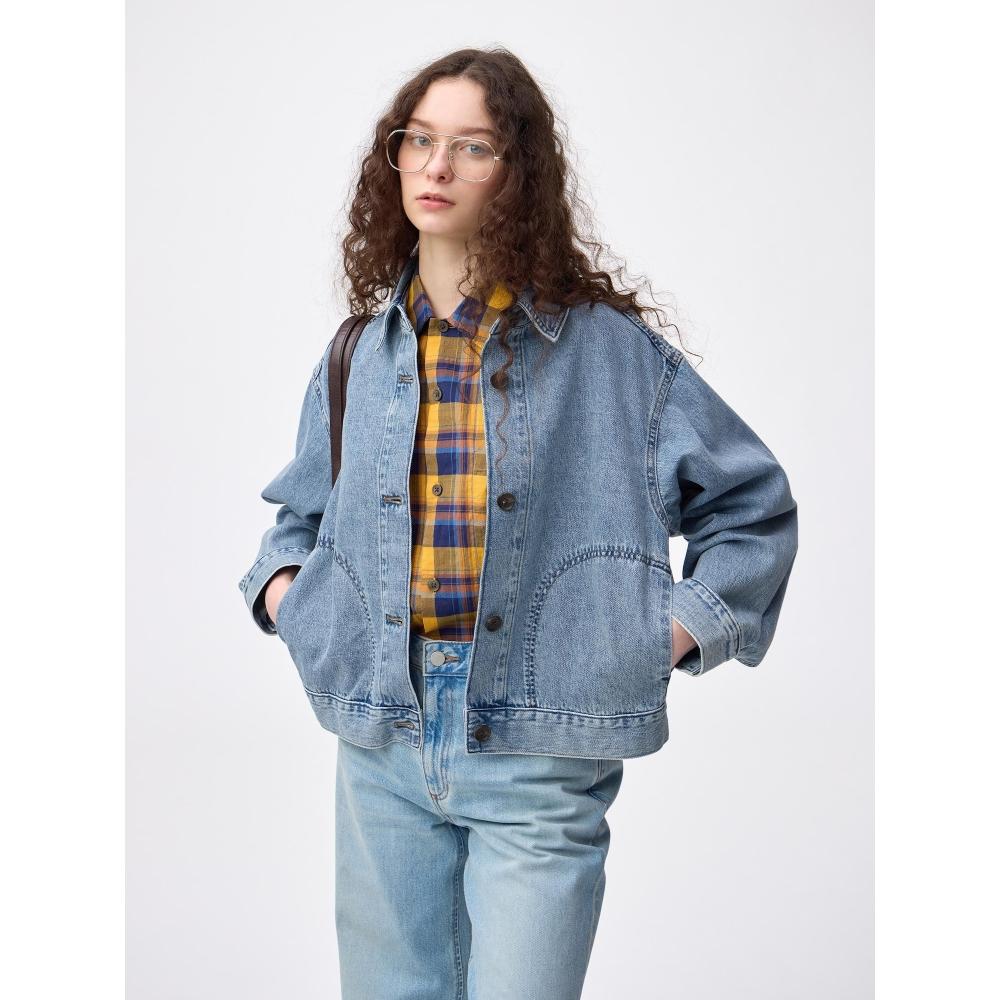 This denim jacket is made from soft denim material, allowing for comfortable wear. The unique tuck at the back adds a stylish touch, while the rounded, boxy silhouette is a defining feature. The sleeve buttons allow for silhouette adjustments, enabling various styling options.