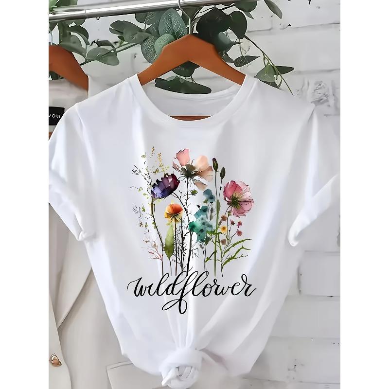 European Size Women'S Floral Print Crew Neck T-Shirt - "Wildflower" Design, Casual Short Sleeve Tee for Spring & Summer