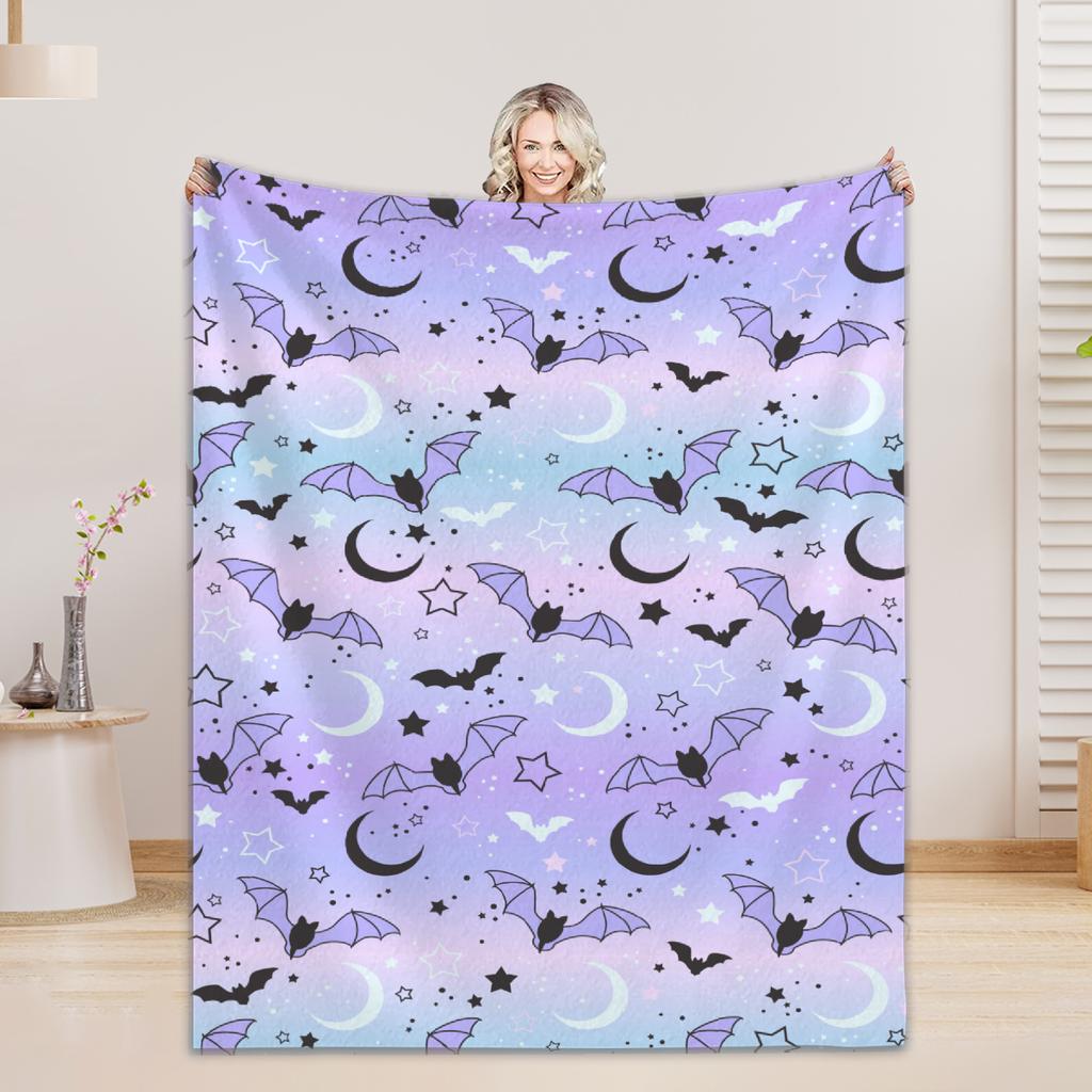 1 szt. Koc Happy Halloween Fioletowe Niebo Nietoperze Księżyc Nadruk 3D Koc Flanelowy do Dekoracji Domu Pokoju Dziennego Prezent na Imprezę Halloweenową