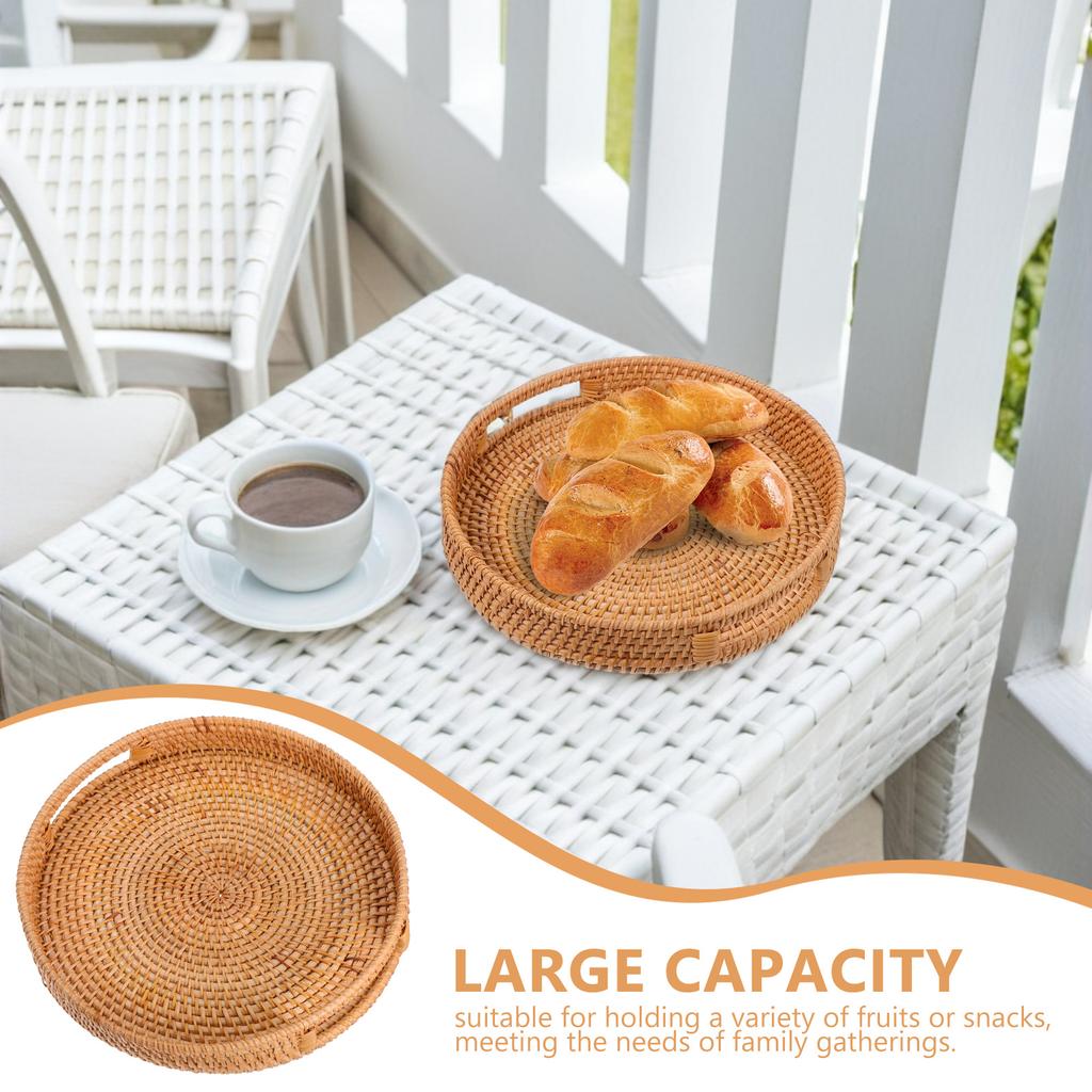 Round Rattan Tray 14-Inch Woven Fruit Bowl Hollow Handle Design Natural Material Kitchen Dining Table Round Tray with Sides