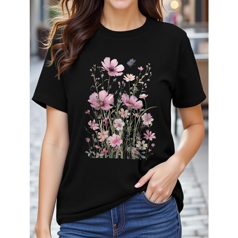 Unisex Różowa Koszulka z Kwiatowym Wzorem Okrągły Dekolt Krótki Rękaw Luźny Krój Trening na Siłownię Całoroczna Codzienna Miękka Oddychająca Góra