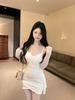 Autumn new sexy dress low-cut square neck mesh fringed slim-fit pleated hip-wrapped bottoming long-sleeved dress