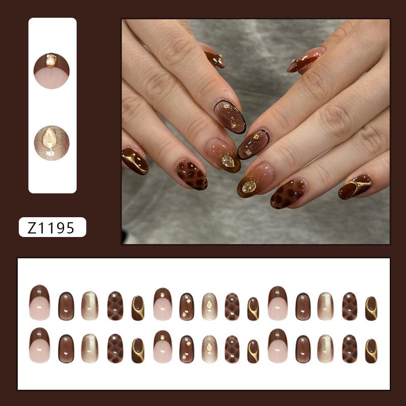 Bright gold-brown shining diamond French cat cat eye temperament white European and American style removable manicure 30 pieces