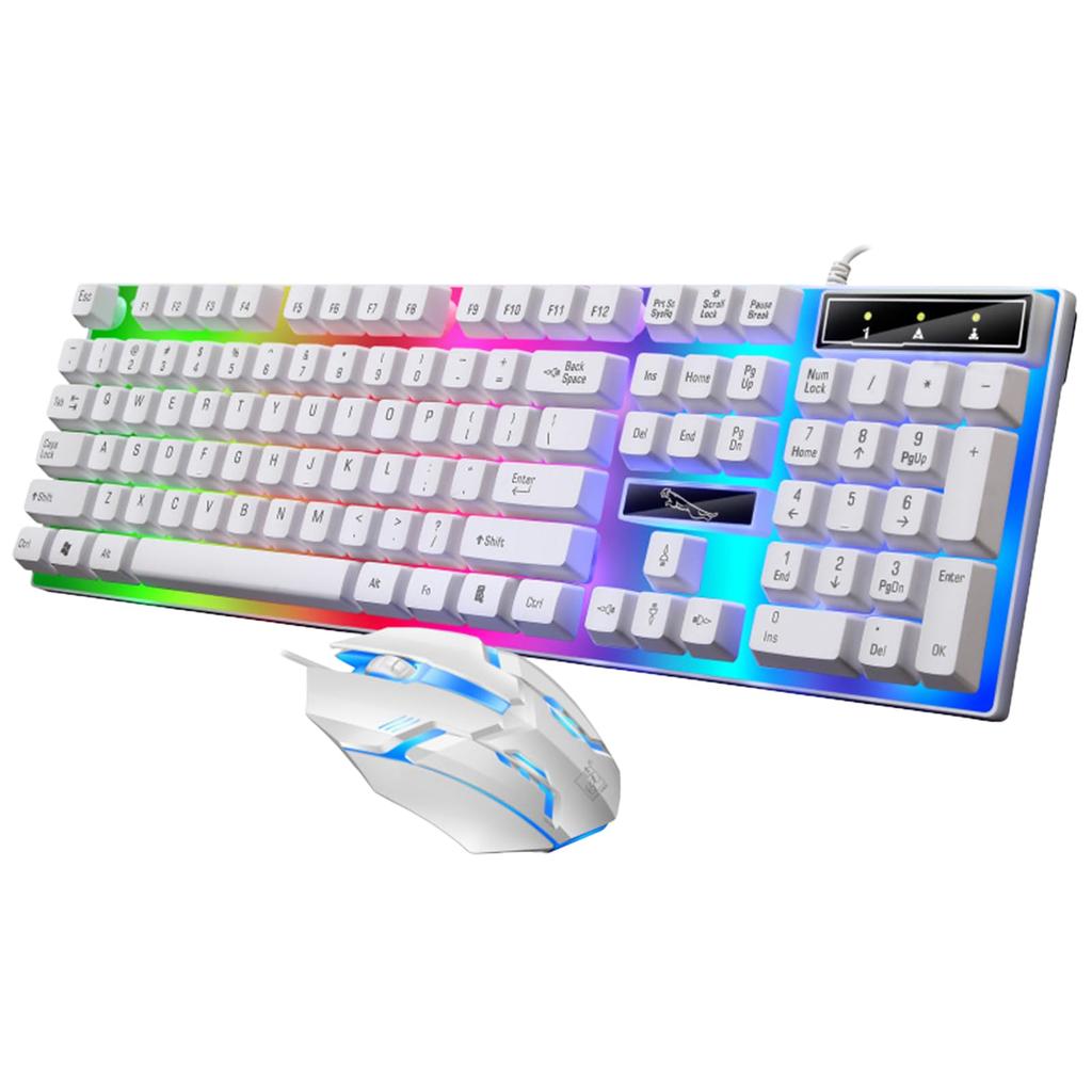 Package includes: Optical mouse (12.6x7x3.3cm) + gaming keyboard (44x12.7x3cm). USB interface, weighs approximately 750g. To illuminate, press the light-on key (SCROLL LOCK).