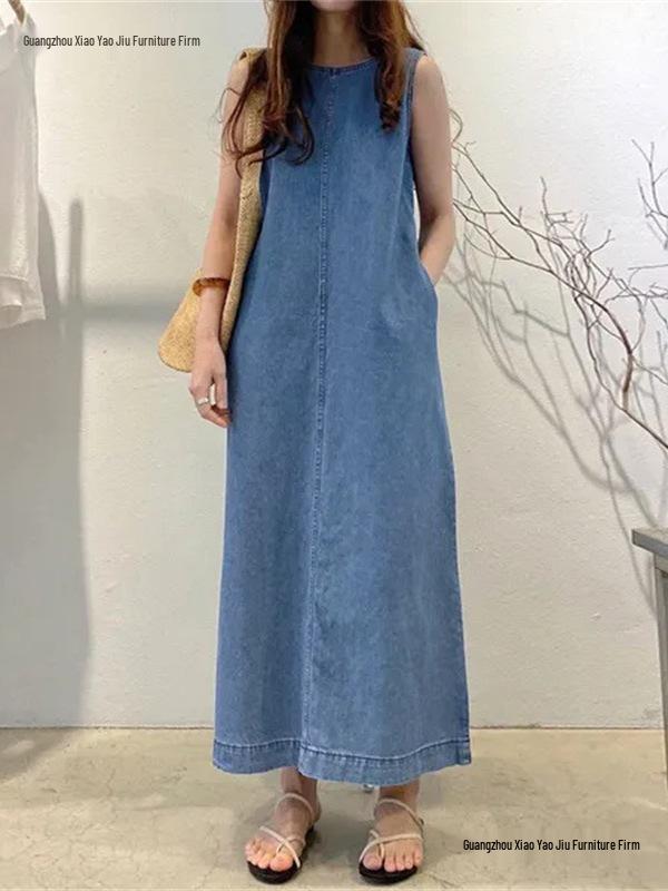 Women's Sleeveless Denim Long Skirt Dress with Pockets