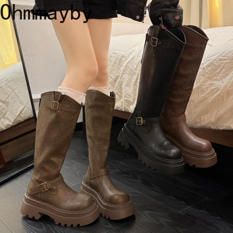 Winter Platform Thick Heel Woman Knight High top Fashion Belt Buckle Female Punk Retro Long Booties De Muje