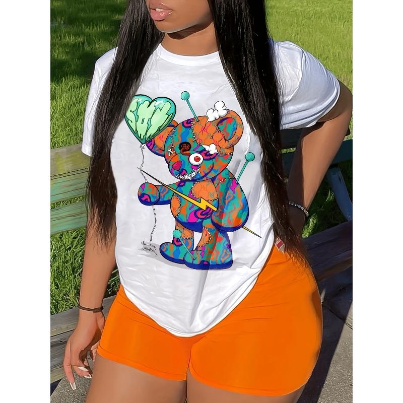 Kolorowy T-shirt z nadrukiem misia, europejski rozmiar, casualowy T-shirt z okrągłym dekoltem i krótkim rękawem na wiosnę i lato, odzież damska