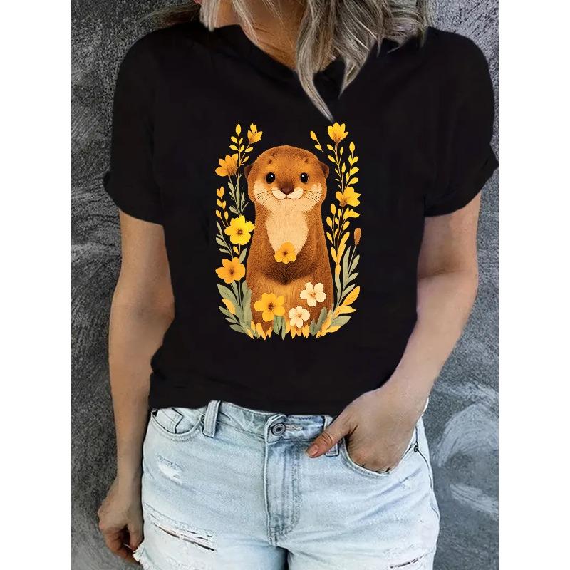 Women's Retro Otter Floral Daisy Print T-Shirt Crew Neck Short Sleeve Regular Fit Soft All-Season Machine Washable Casual Top