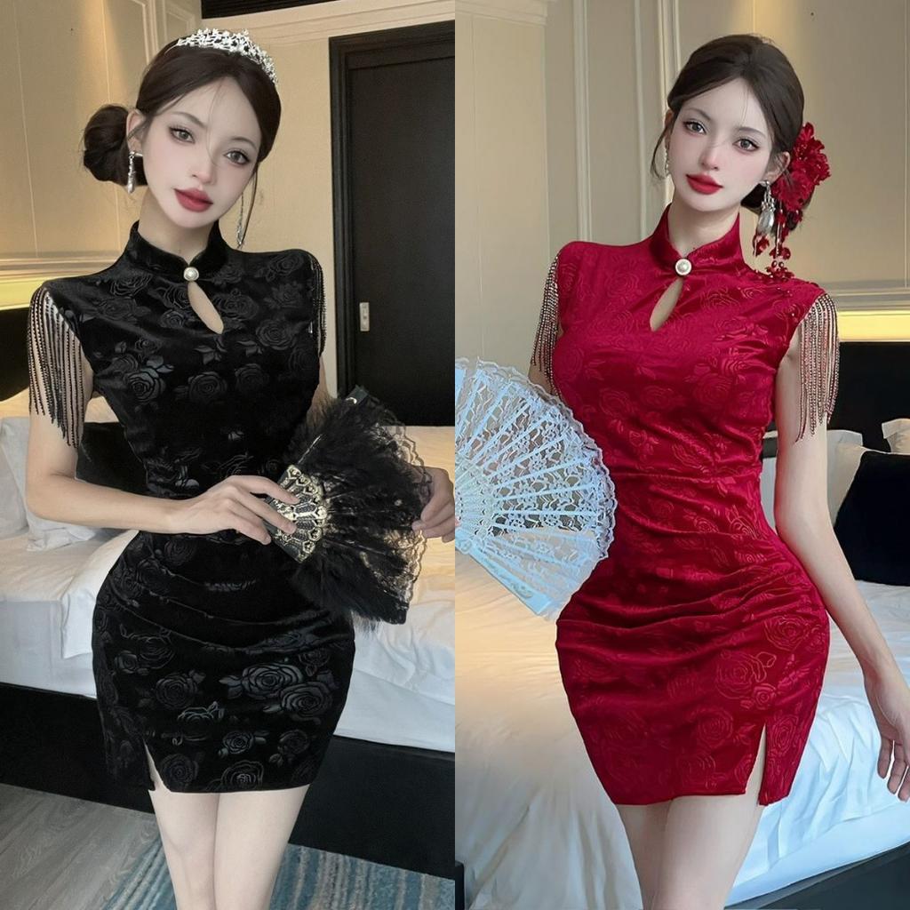 Skirt new high-end new Chinese sexy short golden velvet cheongsam slim versatile hip-wrapped bottoming dress