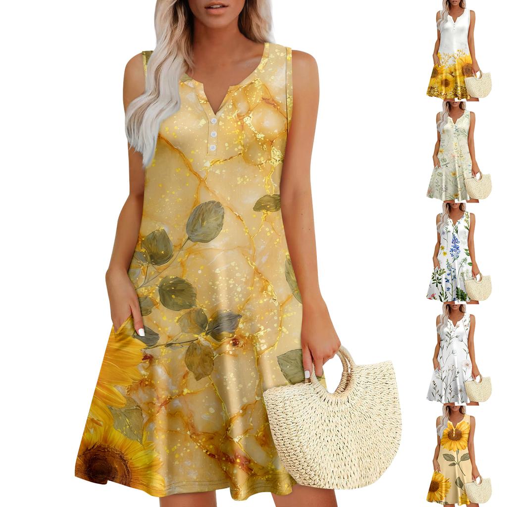 Damskie letnie sukienki, luźne, bez rękawów, dekolt w serek, sukienki letnie z kieszeniami