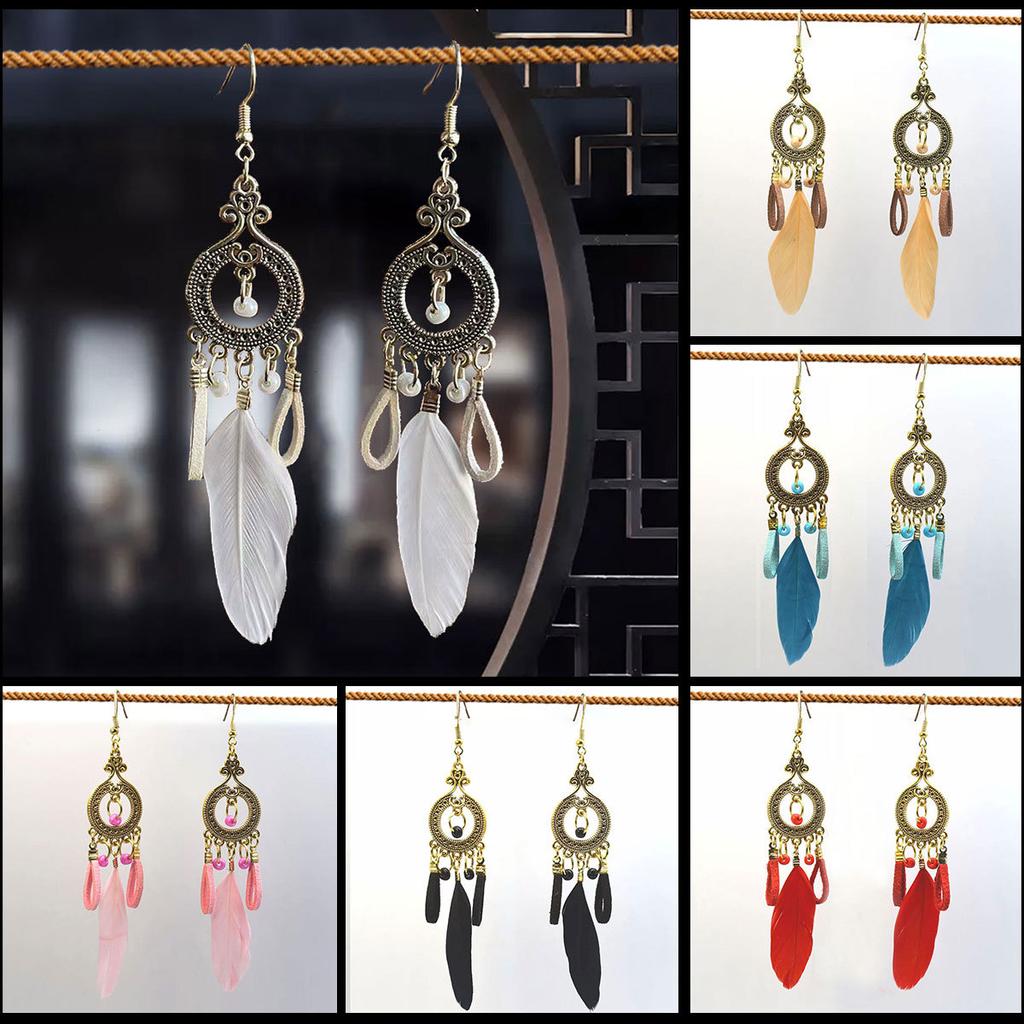 Ethnic Style Long Feathered Fringed Earrings Retro Bohemian Travel Auction Earrings Jewelry