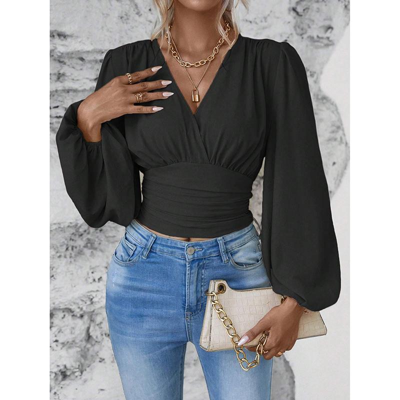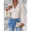 Wiosna Jesień Casualowy Damski Top Modny Kolekcja Talii Seksowny Dekolt V Rękaw Torba Jednolity Kolor Zmarszczony Top z Długim Rękawem