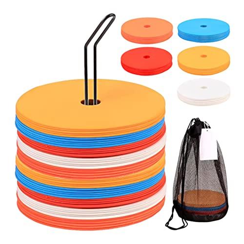 Heizi Flat Markers, 5 Colors, 50 Pieces, Flat Cones for Soccer, Track & Field, and Basketball (Includes 50 Pieces, Stand, and Storage Bag)