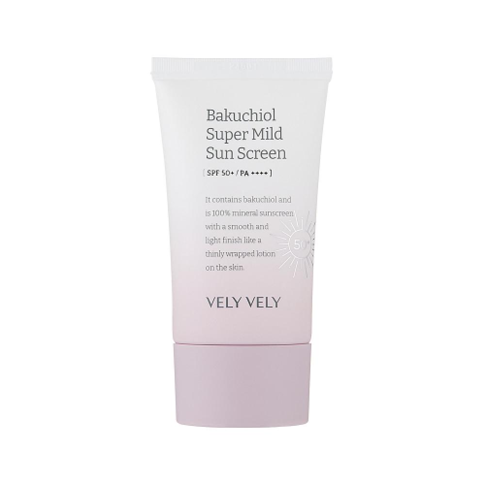 VELY VELY Bakuchiol Super Mild Sunscreen 50ml is a product with powerful UV protection of SPF50+/PA++++. This product contains bakuchiol, providing benefits for sun protection, wrinkle improvement, and skin brightening. Its soft texture absorbs quickly into the skin, leaving a non-sticky and refreshing feel.