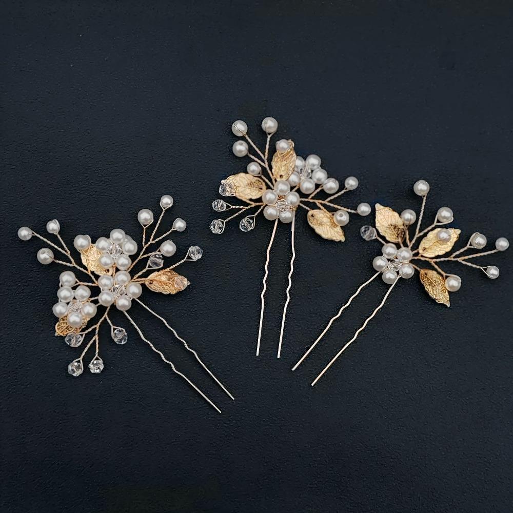 1 Zestaw spinki do włosów z kwiatem perłowym Zestawy grzebieni do włosów dla panny młodej Ślubne akcesoria do włosów Tiarki ze stopu ze złotym liściem Spinka do włosów księżniczki Modna biżuteria