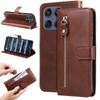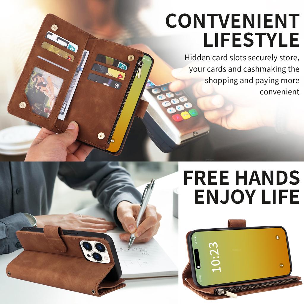For iPhone 15 Pro Case Zipper Multi-Pocket Wallet Leather Phone Cover with Shoulder and Wrist Straps