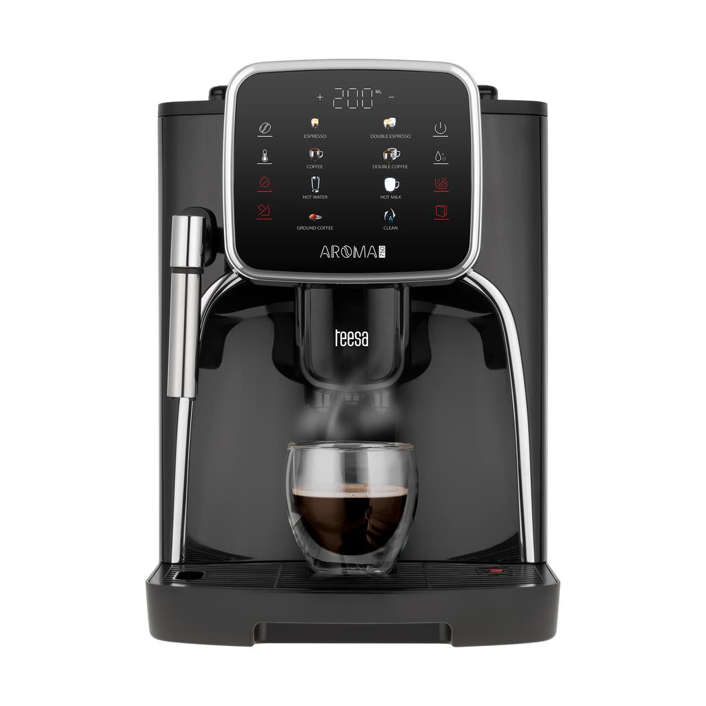 TEESA AROMA 750 Automatyczny ekspres do kawy z młynkiem Właściwy ekspres do kawy to klucz do idealnego poranka. Teesa Aroma 750, dzięki ciśnieniu 19 barów i profesjonalnym ustawieniom, pozwoli Ci w pełni uwolnić potencjał każdego ziarna kawy, wydobywając głęboki i intensywny smak.. Tak jak lubisz Nie musisz już marnować cennego czasu na mielenie kawy! Automatyczny ekspres do kawy Aroma 750 posiada wytrzymały, stalowy młynek, który precyzyjnie mieli każde ziarno, gwarantując optymalny smak każdej kawy, od espresso po większe filiżanki.. Oprócz pojemnika na ziarna, urządzenie jest wyposażone w oddzielny lejek na kawę mieloną.. Intuicyjna obsługa Nowoczesny ekran dotykowy LCD sprawia, że obsługa Teesa Aroma 750 jest wyjątkowo prosta. Intuicyjny interfejs umożliwia szybki wybór napoju i dostosowanie parametrów.. Oznacza to, że nawet początkujący może łatwo zaparzyć idealną kawę. Personalizacja ustawień kawy Z Aroma 750 możesz precyzyjnie dostosować swoją kawę do własnych upodobań. Regulacja ilości kawy, mocy, temperatury i stopnia zmielenia zapewnia, że każda filiżanka spełni Twoje oczekiwania.. Dodatkowo możesz regulować wysokość dozownika kawy, dzięki czemu zmieścisz nie tylko filiżankę do espresso lub cappuccino, ale nawet swój ulubiony kubek.. Przygotuj dwie kawy jednocześnie Z drugą połówką, przyjacielem lub mamą – delektuj się smakiem idealnie zaparzonego espresso. Funkcja dwukubkowa skraca czas przygotowania o połowę. Jest idealny na poranne spotkania przy kawie w domu lub w biurze.. Funkcja podgrzewania filiżanek Zimna filiżanka nie tylko obniża temperaturę kawy, ale także negatywnie wpływa na jej smak i aromat. Więc przed nalaniem kawy do pustego kubka, postaw go na płycie podgrzewającej.. Ta funkcja utrzymuje kawę gorącą dłużej, a aromat i smak będą bardziej intensywne.. Dysza do spieniania mleka Z Aroma 750 stworzysz idealne cappuccino lub latte w zaledwie kilka chwil. Automatyczny ekspres do kawy Teesa posiada dyszę do spieniania mleka, która pozwala dodać do kawy delikatną i kremową piankę.. Idealny do Twojej kuchni Aroma 750 jest nie tylko funkcjonalny, ale także stylowy. Jego nowoczesny i elegancki design doskonale wpasuje się zarówno w kuchnie domowe, jak i biurowe.. Wszechstronne kolory i kompaktowe wymiary sprawiają, że ekspres do kawy Teesa jest dekoracyjnym dodatkiem do każdego wnętrza, łącząc estetykę z doskonałą jakością..