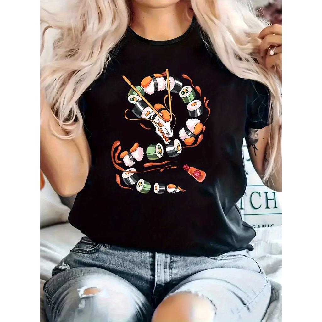 Sushi Print Women's Casual T-Shirt, Round Neck, Short Sleeved, Slightly Elastic Fabric T41