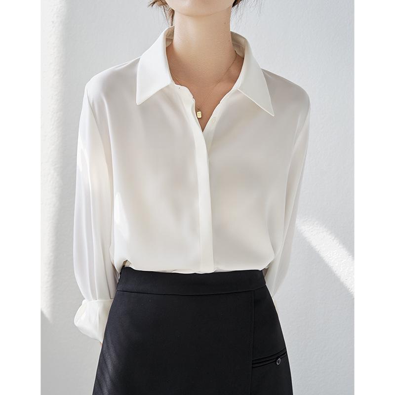 Women's Long Sleeve White Satin Shirt - Spring/Autumn 2026, High-Grade Acetate, Anti-Wrinkle, Perfect for Office Wear