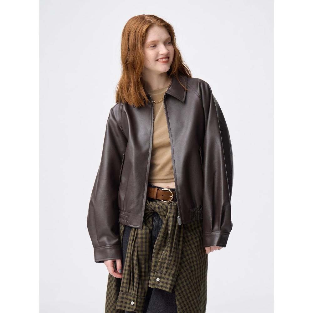 This jacket features a classic blouson base with a rounded design.