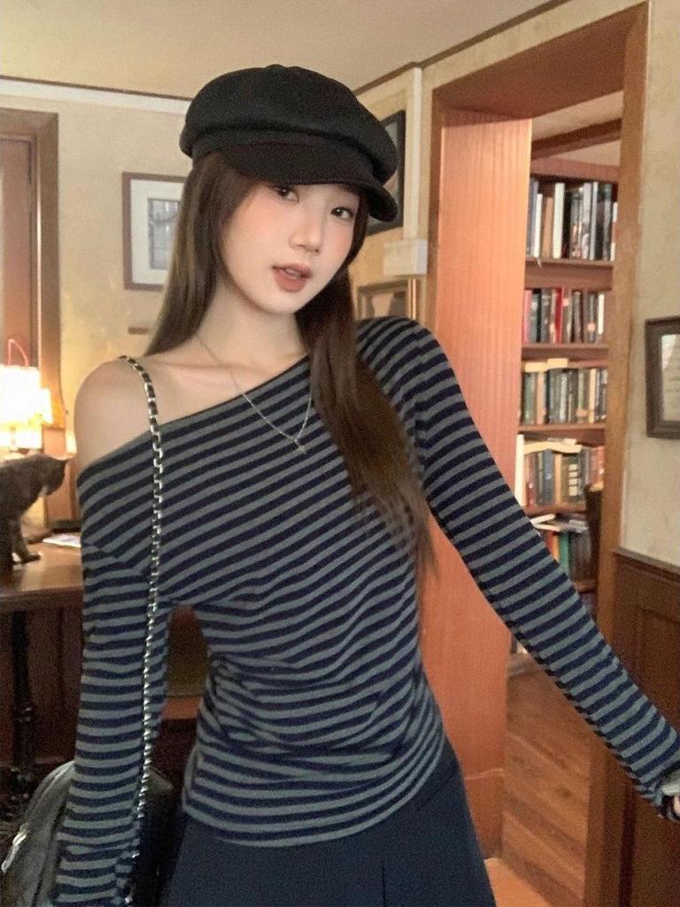 Women's Gray Striped One-Shoulder Long-Sleeve T-Shirt - Slimming Waist, Comfortable, Casual, Versatile - New for Early Autumn 2026