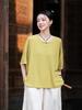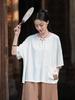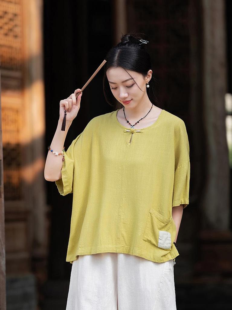 Damski Retro Okrągły Dekolt Guziki Żabki Bawełna Len Krótki Rękaw Top