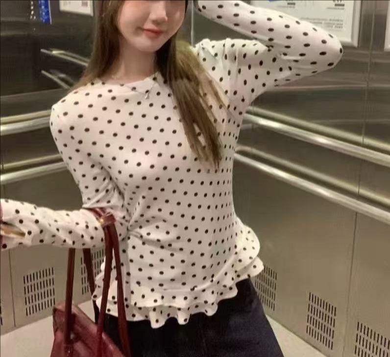 Damska biała koszulka z długim rękawem w grochy z falbanką - wyszczuplająca, słodka wiosenna stylizacja