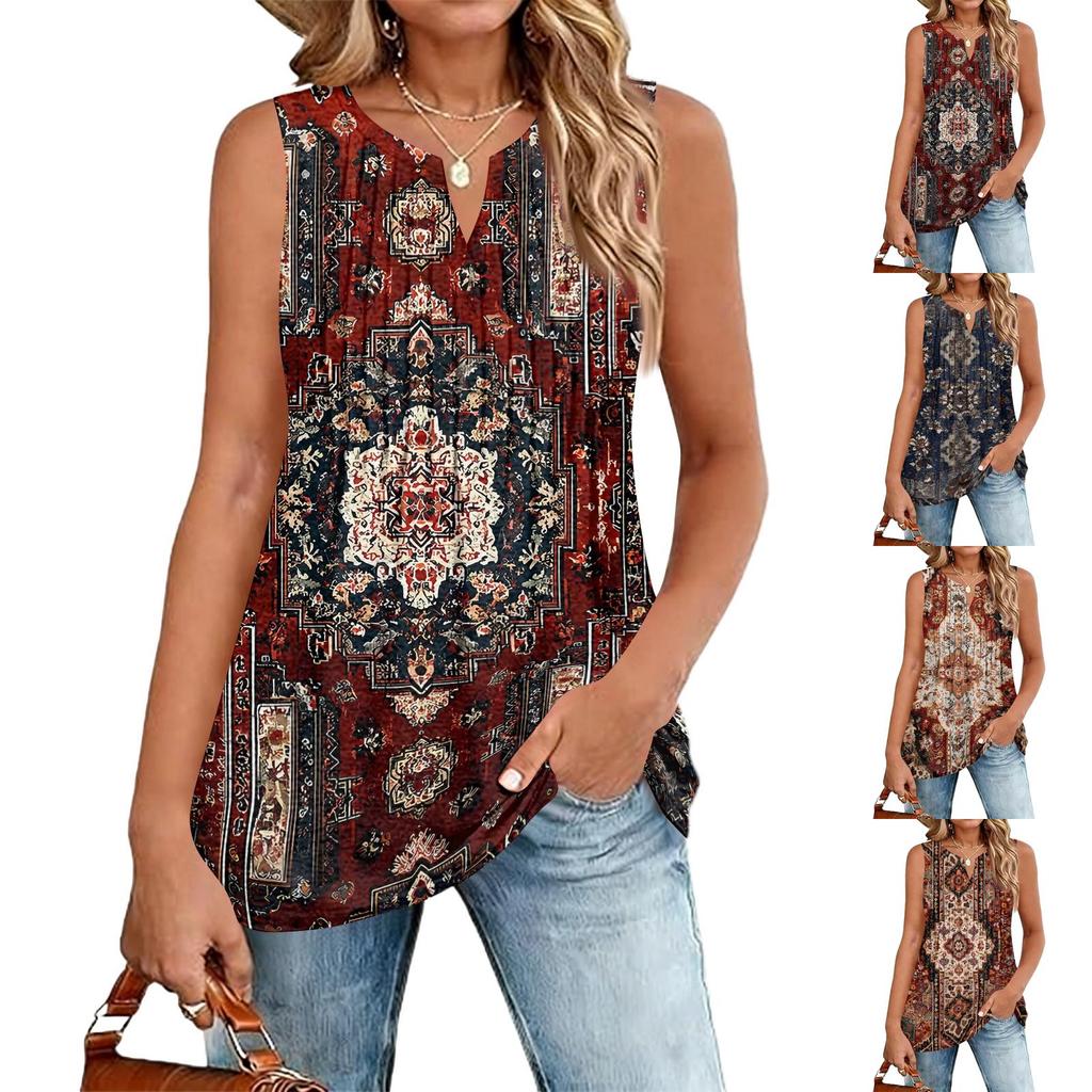 Damski Nowy Retro Kwiatowy Pasiasty Teksturowany Nadruk Dekolt V Luźny Codzienny Plisowany Bezrękawnik Top
