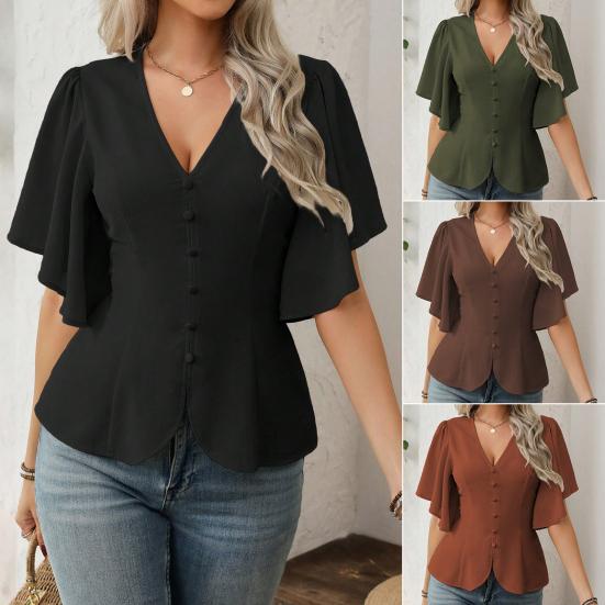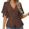 Damskie Bluzki Dekolt V Krótki Rękaw Motylkowy Jednorzędowa Koszula Miękki Elastyczny Design w Pasie Casualowa Bluzka Na Imprezę Wakacje Biuro Randkę