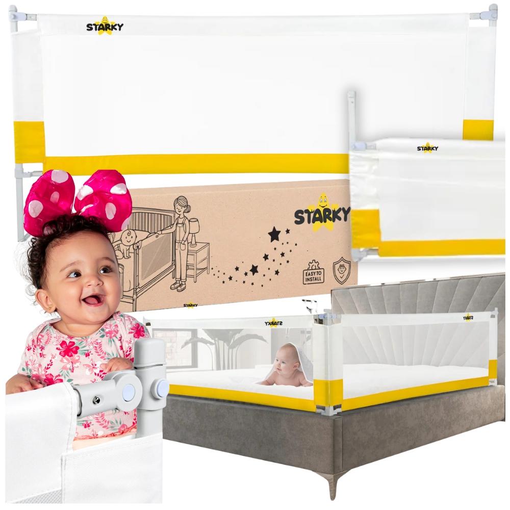 Barierka ochronna do łóżka z blokadą Zabezpieczenie dziecka podczas snu Martwisz się o bezpieczeństwo swojego dziecka podczas snu? Budzisz się w nocy zmartwiony, że Twoje maleństwo może wypaść z łóżka? A może szukasz praktycznego rozwiązania, które zapewni spokojny sen zarówno Tobie, jak i Twojemu dziecku? Rozumiemy Twoje zmartwienie! Każdy rodzic chce zapewnić swojemu maluchowi spokojny i bezpieczny sen. Dlatego mamy dla Ciebie rozwiązanie, które pozwoli Ci odpocząć bez stresu. Dzięki barierkom do łóżka możesz zapobiec przypadkowemu wypadnięciu dziecka podczas snu.. Łatwe w montażu i stabilne – są idealnym wsparciem zarówno w domu, jak i podczas podróży. Zadbaj o spokojne noce dla siebie i swojego dziecka już dziś! ZAUFANIE I BEZPIECZEŃSTWO KAŻDEJ NOCY Barierka do łóżka Starky jest idealnym rozwiązaniem dla rodziców, którzy cenią bezpieczeństwo i komfort swojego dziecka . Wytrzymała konstrukcja zapobiega przypadkowemu stoczeniu się z łóżka, a jego oddychający materiał siatkowy zapewnia odpowiednią wentylację.. Dzięki zaokrąglonym narożnikom i piance osłaniającej, rama barierki jest całkowicie bezpieczna dla maluchów, a jej solidna konstrukcja gwarantuje długotrwałe użytkowanie.. Aby otoczyć całe łóżko, należy zakupić jeszcze dwie barierki STARKY i połączyć narożniki za pomocą dołączonej osłony STWORZONO Z MYŚLĄ O BEZPIECZEŃSTWIE RODZICÓW I DZIECI Osłona została zaprojektowana z myślą o komforcie rodziców i dzieci . 24 poziomy regulacji wysokości pozwalają dopasować ją do materacy o grubości od 10 do 28 cm, a możliwość opuszczenia barierki poniżej poziomu materaca ułatwia wstawanie i wstawanie z łóżka bez konieczności jej demontażu.. To praktyczne rozwiązanie oznacza, że szyna nie przeszkadza w codziennym użytkowaniu, jednocześnie zapewnia pełną ochronę podczas snu.. UNIKALNY SYSTEM BEZPIECZEŃSTWA DO OPUSZCZANIA BARIERKI Barierka jest wyposażona w innowacyjny mechanizm bezpieczeństwa, który zapobiega samodzielnemu opuszczeniu jej przez dziecko. Aby obniżyć barierę, należy jednocześnie nacisnąć dwa przyciski po każdej stronie, co zapewnia pełne bezpieczeństwo i daje rodzicom spokój, że ich dziecko nie otworzy jej przypadkowo.. KOMPLEKSOWA OCHRONA ŁÓŻKA DZIĘKI DODATKOWYM BARIERKOM Do pełnej ochrony całego łóżka wystarczy dokupić dwie dodatkowe barierki STARKY. Dzięki dołączonej osłonie narożnej możliwe jest stabilne połączenie wszystkich szyn, zapewniając jeszcze większe bezpieczeństwo. Nakładki nie tylko zwiększają stabilność konstrukcji, ale także eliminują wszelkie szczeliny między szynami, zapobiegając tym samym, że Twoje dziecko może się przez nie przecisnąć.. To idealne rozwiązanie dla rodziców, którzy chcą stworzyć całkowicie bezpieczną i komfortową przestrzeń do spania dla swoich maluchów.. TRWAŁOŚĆ I JAKOŚĆ NA LATA Rama wykonana jest z lekkiego, wzmocnionego metalu , który nie odkształca się podczas użytkowania, a materiał bariery można prać ręcznie , co ułatwia utrzymanie go w czystości. Produkt spełnia najwyższe standardy bezpieczeństwa , EN IEC 71-1:2014+A1:2018, EN IEC 71-2:2011+A1:2014, EN IEC 71-3:2019, co czyni go niezastąpionym elementem każdej sypialni. IDEALNY PREZENT DLA NOWYCH RODZICÓW Barierka zabezpieczająca Starky to doskonały pomysł na prezent dla rodziców, którzy właśnie rozpoczęli swoją przygodę z rodzicielstwem. Funkcjonalność, bezpieczeństwo i nowoczesny design sprawiają, że jest to produkt, który będzie przydatny w każdym domu.. Neutralne kolory idealnie wpasują się w każde wnętrze, niezależnie od stylu aranżacji, czyniąc barierę praktycznym i estetycznym elementem pokoju dziecka.. MOBILNOŚĆ I ŁATWY MONTAŻ Montaż barierki do łóżka jest niezwykle prosty – wystarczy wsunąć jej ramiona między łóżko a materac lub przykręcić ją do ramy łóżka pod materacem za pomocą dołączonych śrub.. Po złożeniu produkt zajmuje bardzo mało miejsca, co czyni go idealnym towarzyszem podróży.. Możesz cieszyć się jego funkcjonalnością zarówno w domu, jak i na wakacjach, zapewniając bezpieczeństwo swojemu dziecku w każdej sytuacji.. IDEALNE DOPASOWANIE DO MATERACA Barierka do łóżka została zaprojektowana do materacy o długości 200 cm, zapewniając idealne dopasowanie. Sam bok barierki ma 197 cm długości, co pozwala na stabilne zamocowanie systemu mocowania między materacem a ramą łóżka.. Dzięki temu rozwiązaniu balustrada nie tylko doskonale spełnia swoją funkcję ochronną, ale także pozostaje stabilna i bezpieczna przez cały czas użytkowania.. SPECYFIKACJA marka: Wymiary Starky: 197cm x 73cm ilość: 1 szt. materiał: poliester, plastik, metal kolory: biały/żółty dopuszczalny wiek i waga dziecka: od 0 miesięcy do 5 lat lub do 20 kg regulowana wysokość: tak zamierzone użycie: materace o grubości 10–28 cm instrukcja w języku polskim Cena dotyczy 1 sztuki. Zainwestuj w bezpieczeństwo i komfort swojego dziecka – wybierz barierkę łóżka Starky! SPRAWDŹ, CO MA CI DO ZAOFEROWANIA NASZA MARKA STARKY! Starky to marka dedykowana dzieciom. Naszym celem jest dostarczanie produktów najwyższej jakości, które rozwijają umysły i inspirują kreatywność.. Oferujemy szeroki wybór, od zabawek interaktywnych po gry edukacyjne, akcesoria dla niemowląt, zabawki drewniane i wiele, wiele więcej.. Tutaj znajdziesz nieskończone pomysły na prezenty dla swoich bliskich! Sprawdź nasze inne oferty