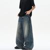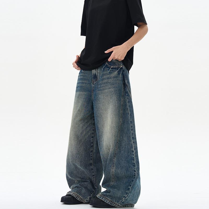 LKTM Unisex Amerykańskie Retro Niebieskie Spodnie Dżinsowe Baggy z Tie-Dye i Zakrzywioną Nogawką