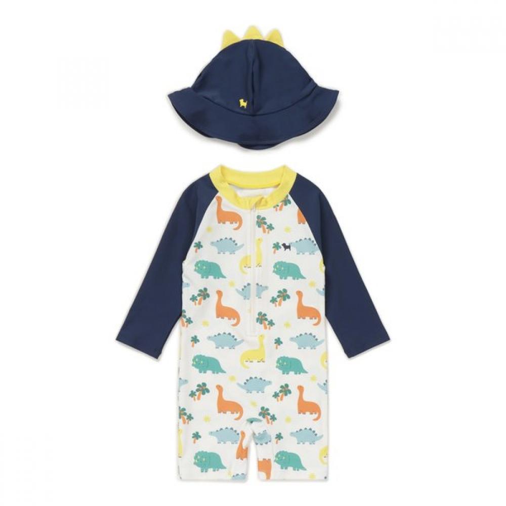 This is an all-in-one swimsuit set with a dinosaur pattern unique to Blue Dog Baby's theme.